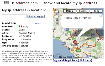 Di servizi online che permettono di sapere informazioni su un IP ce ne sono molti. Questo nuovo servizio offerto da IP-address è davvero utile. Oltre a dare informazioni sul provider da anche la latitudine e longitudine, che grazie a google map possiamo subito scoprire dove si trova. In italia nei maggiori dei casi si ferma al nodo della centrale più vicina, ma in alcuni casi potrete arrivare a vedere addirittura la casa o il palazzo dell’Ip ricercato. Da provare e mettere nei preferiti.
