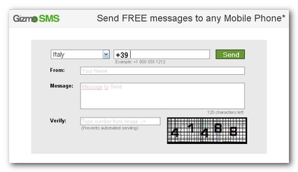 Gizmosms è un sito che ci permette d’inviare sms infiniti gratuitamente in più di 200 paesi al mondo. Il servizio attualmente è gratuito anche per l’Italia, “dico attualmente” perchè in teoria dovrebbe essere gratuito, ma se dovesse essere preso di mira dai ricaricatori folli italiani penso che durererebbe molto poco. L’invio degli Sms è semplicissimo, non necessita neanche della registrazione, basta inserire il paese, il mittente, il numero e scrivere ovviamente il messaggio. Speriamo che duri! 🙂