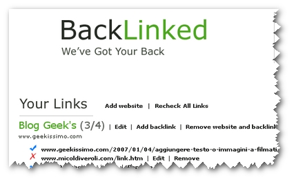 BackLinked è un sito molto semplice dalla grafica pulita ed essenziale, che ci offre la possibilità di monitorizzare i backlinks all’interno del nostro sito o blog. Basta aggiungere il sito con i link che ci puntano, in questo modo potremo avere sempre la situazione sott’occhio.