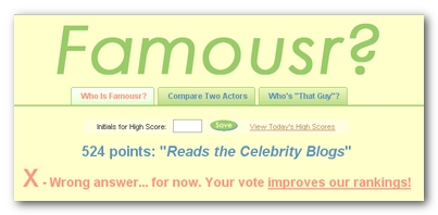 Vediamo se siete preparati e conoscete bene i Vip, su Famousr infatti potrete mettere alla prova la vostra conoscenza dei personaggi famosi guardando confronti diretti tra 2 Vip e votando quello più famoso tra i 2. Io me la sono cavata benino ho fatto 524 punti con una serie di 9 risposte esatte.