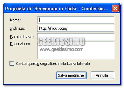 Se vogliamo visualizzare solamente la favicon relativa ad un sito, clicchiamo con il tasto destro su di essa, scegliamo la voce Proprietà e cancelliamo tutto quello scritto nella casella del Nome. Ora solamente la favicon di quel sito verrà visualizzata.
