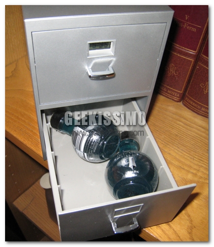Esternamente, nella parte superiore, si trova un mini orologio per poter sempre visualizzare l’ora. Aprendo il primo cassetto in alto inoltre troviamo tutte le schede, in ordine alfabetico, per catalogare i nostri biglietti da visita o dei piccoli foglietti.