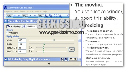 Un software leggerissimo, che possiamo scaricare liberamente da questo indirizzo. Il file, in formato .exe, va semplicemente eseguito, non necessitando di installazione. Le funzioni principali che AltMove può fornire, secondo il sito del software, sono abilità di movimento/spostamento e ridimensionamento di finestre, gestione della loro visibilità e della traparenza e possibilità di effettuare combinazioni mouse/keyboard per velocizzare l’esecuzione di certe operazioni o per aprire file e programmi in un qualunque punto del desktop.