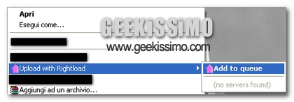 Dopo aver effettuato correttamente l’impostazione dei dati, è possibile cominciare ad utilizzare il programma. E’ sufficiente un clic destro sul file che si desidera caricare sul server, per scoprire la novità: l’installazione di Rightload ha integrato una nuova voce nel menu contestuale, come testimonia l’illustrazione successiva.