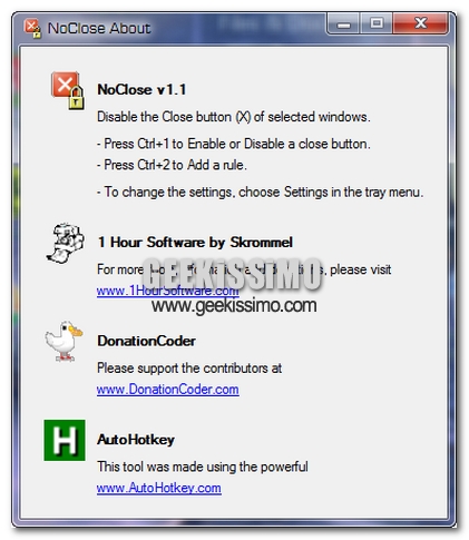 Questa, liberamente scaricabile da qui, non richiede alcuna installazione. Dopo essere stato avviato, il programma fornisce qualche hotkey da tenere a mente per attvare/disattivare il pulsante Chiudi delle finestre attive: Ctrl + 1 oppure Ctrl + 2, per creare una nuova regola. Ulteriori impostazioni presenti in Settings (clic dx sull’icona di NoClose in system tray).