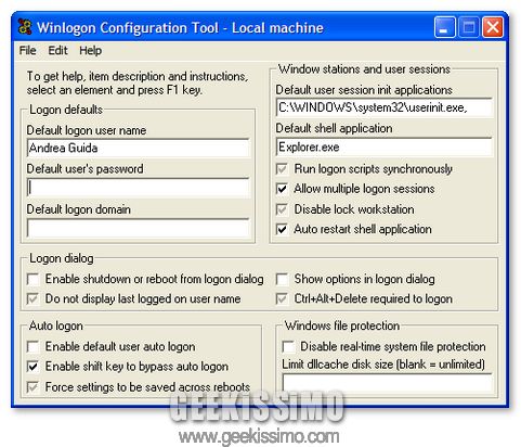 Con Winlogon Configuration Tool, questo il suo nome, è infatti possibile variare impostazioni e compiere operazioni quali:
