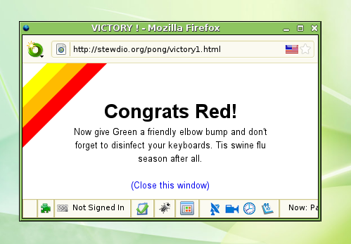 Quel che vogliamo proporvi quest’oggi è qualcosa che gli somiglia ma è implementato sui browser. Mi spiego. Browser Pong è l’emulazione del ping pong tramite browser. Infatti, per giocare basterà collegarsi alla home e premere Play ( tasto P ). Verranno aperti esattamente 3 popup. Noi, l’avversario e la pallina. Sì avete capito bene. Giocherete a ping pong tramite il browser attuale che state utilizzando ( Firefox, Internet Explorer, Chrome ). Una dimostrazione qui sotto: