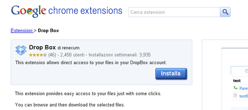 Ma Dropbox perchè quest’oggi è correlato a Google Chrome? Beh semplice. Perchè da quando questo browser è stato sviluppato è possibile aumentarne le capacità grazie alle sue estensioni talvolta molto utili. E’ il caso appunto di Dropbox e della sua estensione sviluppata proprio per il browser di casa Google.