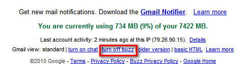 Google Buzz vi ha già stufati e volete rimuoverlo dalla vostra casella Gmail? Basta cliccare sul link turn off buzz collocato a fondo pagina nella web-mail di Google e il gioco è fatto.