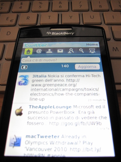 Come vedete dall’immagine di apertura, abbiamo provato Twitter per BlackBerry con un BlackBerry Storm2: il programma si è comportato sempre bene anche con l’uso del touchscreen. In attesa del rilascio ufficiale di Twitter per BlackBerry, che ricordo sarà disponibile gratuitamente, personalmente utilizzerò questa beta al posto di UberTwitter principalmente per il fatto che posso avere sempre sotto controllo i tweet senza che la batteria si esaurisca in poche ore.