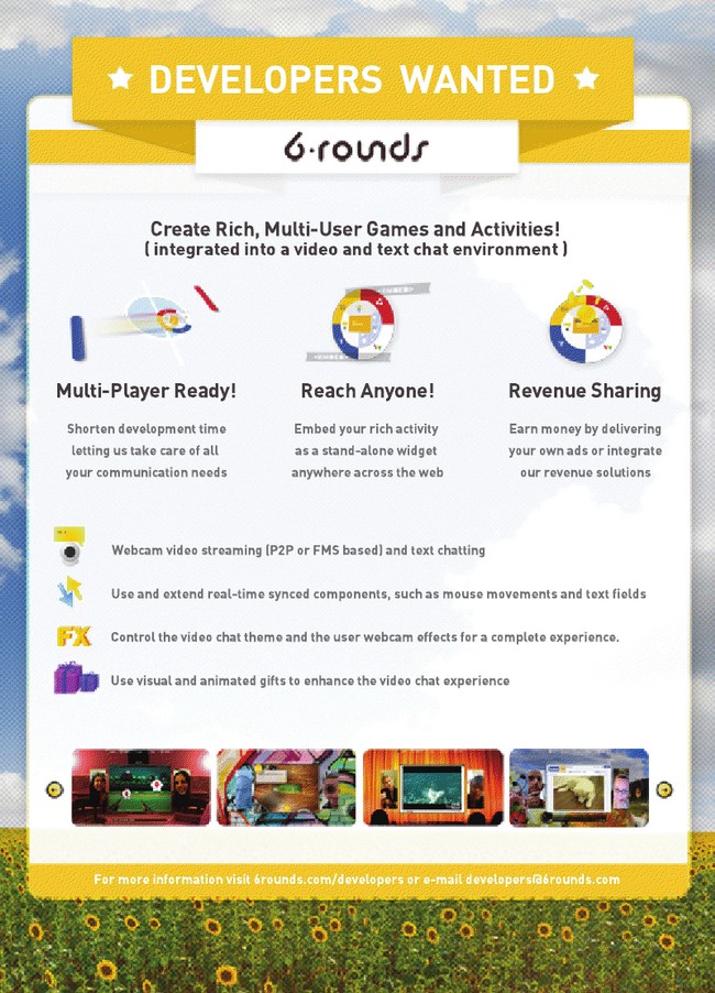 Verranno rese disponibili le API di 6rounds in modo da dare la possibilità agli sviluppatori di creare applicazioni proprie basate sulla videoconferenza del servizio. Qui di seguito vi allego il volantino che gli sviluppatori stanno distribuendo al Google I/O: