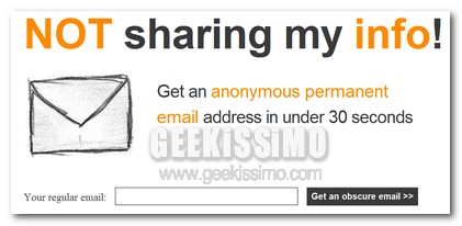 Utilizzare il servizio è semplicissimo oltre che rapidissimo poiché, una volta aperta la relativa pagina web, tutto ciò che dovremo fare non sarà altro che inserire nell’apposito spazio vuoto visualizzato il proprio indirizzo e-mail reale, cliccare dunque sul pulsante Get an obscure email>> e, infine, attendere che Not Sharing My Info restituisca l’indirizzo e-mail falso che sarà del tipo [email protected].