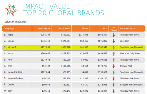 Tenendo conto di tale metro di giudizio, alla fine del 2010 Microsoft ha realizzato un buzz mediatico pari a 702.549$ così ripartito: 197.268$ dai siti d’informazione, 41.353$ da Twitter e 463.928$ dai social network, che sono dunque stati la principale fonte di “guadagno mediatico” per il colosso di Redmond nell’anno appena trascorso.