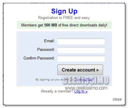 Nella parte alta dell’interfaccia, trovate una serie di link, tra questi ponete l’attenzione su Sign Up, Premium e Direct Download. E’ possibile effettuare una registrazione gratuita per scaricare (gratuitamente) fino a 500MB al giorno; nel corso della registrazione non viene richiesto altro che un indirizzo Email e la password da associare all’account.