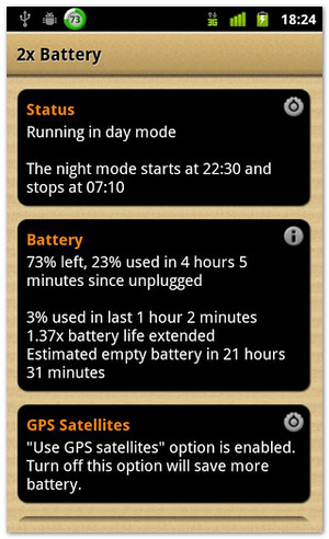2x Battery – un’applicazione nata principalmente per ottimizzare l’uso della batteria (raddoppiarlo secondo la descrizione ufficiale, ma chi ci crede?) abilitando e disattivando all’occorrenza le varie connessioni dello smartphone che include al suo interno la possibilità di visualizzare un’icona con il livello di carica della batteria nella barra di stato di Android.