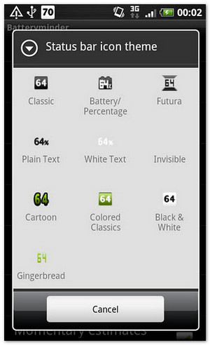 Batteryminder – simpatica applicazione che permette di impostare dei promemoria relativi ai vari livelli di carica della batteria. Tra le sue funzionalità c’è quella che permette di visualizzare la percentuale di carica della batteria nella barra di stato di Android con varie icone. Purtroppo la percentuale visualizzata nell’icona non sembra essere sempre precisissima.