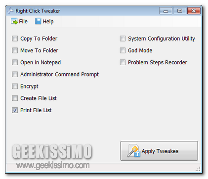Le funzioni che sarà possibile aggiungere al menu contestuale di Windows potranno essere scelte sfruttando l’apposito pannello di settaggio del software (ad inizio post ne è disponibile uno screenshot) e dal quale sarà sufficiente selezionare quanto d’interesse e cliccare poi sul pulsante Apply Tweaks.