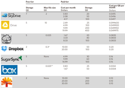 Ars Technica ha riassunto i suoi giudizi con diversi pro e contro che trovate nel post originale. Il succo del discorso è che Box è il servizio più economico, anche se il suo piano base offre lo stesso spazio che SkyDrive offre gratis (25GB); Dropbox non brilla per economicità ma il suo client è molto ben fatto ed è disponibile per la totalità delle piattaforme; SugarSync e SpiderOak sono ottime alternative a Dropbox funzionanti anche su Linux, mentre SkyDrive è l’unica soluzione adottabile per chi vuole usufruire del cloud storage su Windows Phone.