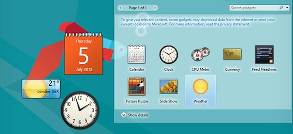 La cosa appare alquanto strana, giacché in tutte le versioni pubbliche del sistema operativo, compresa la recente Release Preview, i gadget sono ancora vivi e vegeti ma pensandoci bene non è poi così improbabile. D’altronde Microsoft sta puntando tutto sull’interfaccia Metro e molti dei live tiles che la compongono (ad esempio quello con le previsioni meteo) possono sostituire in maniera egregia i vecchi widget del desktop.