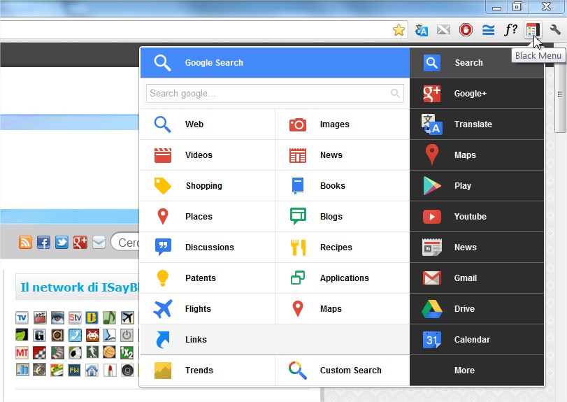 Se volete avere sempre a disposizione i servizi firmati Google, potrete sfruttare una comoda estensione per Google Chrome, Black Menu. Dopo aver installato questo componente aggiuntivo gratis, potrete selezionare la sua icona per vedere apparire un menu verticale di colore nero che contiene i servizi Google più usati dagli utenti.