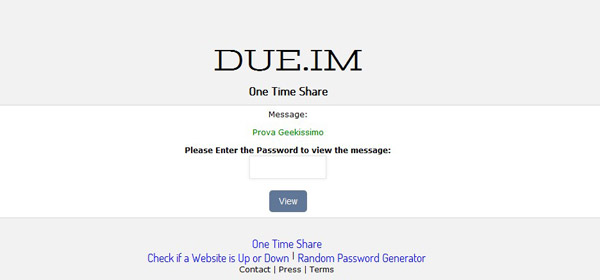 Il contatto che riceverà il link dovrà inserire la parola segreta, se l’avete inserita, e poi potrà visualizzare il contenuto. Due.im è un servizio interessante non solo perché offre la possibilità di inserire una password, ma anche perché il messaggio potrà essere visualizzato una singola volta e successivamente verrà rimosso e, dunque, l’indirizzo di condivisione non sarà più valido.
