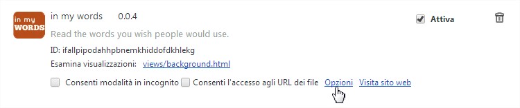 My Words è molto semplice da utilizzare, dopo l’installazione non dovrete far altro che aprire il pannello delle estensioni di Chrome e accedere alle opzioni del nuovo add-on.