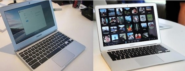 Aggiornamento: come giustamente segnalato da alcuni lettori, dalle immagini presenti nel post non si intuiva chiaramente la somiglianza del Chromebook Samsung con il MacBook Air di Apple. Abbiamo dunque provveduto ad aggiungere una nuova foto, tratta da Twitter, che mette a confronto i due computer. Ad ognuno le proprie valutazioni. 😉