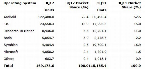 A dominare il mercato degli smartphone è Android, che nel terzo trimestre dell’anno è stato portato a casa da 122 milioni di nuovi utenti arrivando ad una quota di mercato mondiale del 72.4%. Seguono iOS (13,9% di market share) e BlackBerry OS che seppur piazzatosi sul terzo gradino del podio è in caduta libera (da 11% a 5,3% di market share nel giro di un anno).