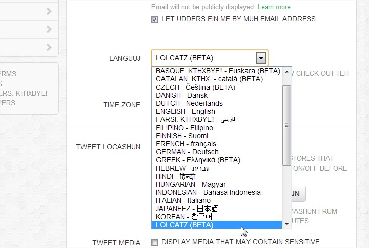 Il boom di gatti sta toccando ogni piattaforma, non solo Facebook, ma anche Twitter è stato coinvolto. L’uccellino azzurro ha molti fan di questa nuova moda? No, proprio il social network ne è divenuto seguace! Lo staff del portale, infatti, ha inserito una nuova bizzarra lingua per le sue pagine, denominata proprio “LOLcat”.