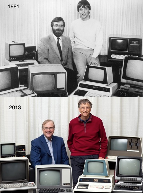 Trentadue anni e svariati miliardi di dollari dopo sono nuovamente lì, uno in giacca e cravatta e l’altro in tenuta casual. Entrambi circondati da quei computer che, in maniera assai differente, hanno segnato le loro come le nostre vite. Stiamo parlando di Bill Gates e Paul Allen che, messi da parte i dissapori nati dall’autobiografia pubblicata nel 2011, hanno riproposto, questa volta via Twitter, lo stesso scatto che nel 1981 segnò l’inizio dell’avventura di MS-DOS sui computer dell’IBM[1].