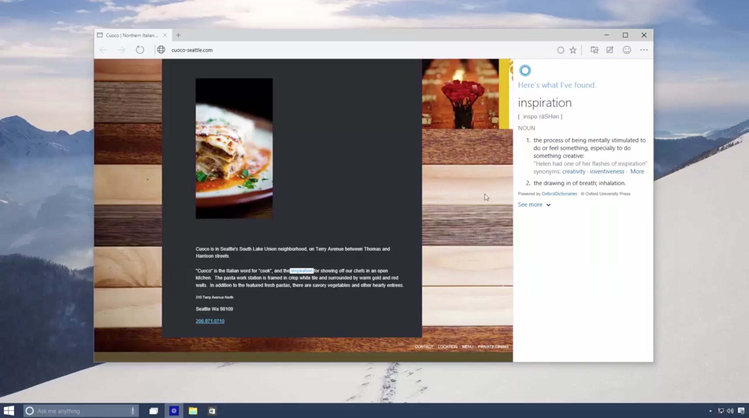 Ad esempio, come possiamo vedere nel filmato qui sotto, visitando il sito di un negozio Cortana propone nella sua sidebar laterale le indicazioni stradali per raggiungerlo, le recensioni di Yelp e altre informazioni utili; evidenziando un termine con il mouse vengono visualizzati i risultati della ricerca nella barra laterale ecc.