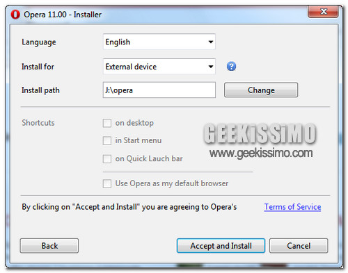 Incredibile ma vero, tutto quello che bisogna fare è avviare normalmente l’installer del navigatore (Opera_installer_1100_1029_en.exe) e cliccare sul pulsante Options che si trova in basso a sinistra. Dopodiché, bisogna selezionare la voce External Device dal menu Install For, specificare la cartella in cui estrarre il browser cliccando su Change e continuare l’installazione normalmente.